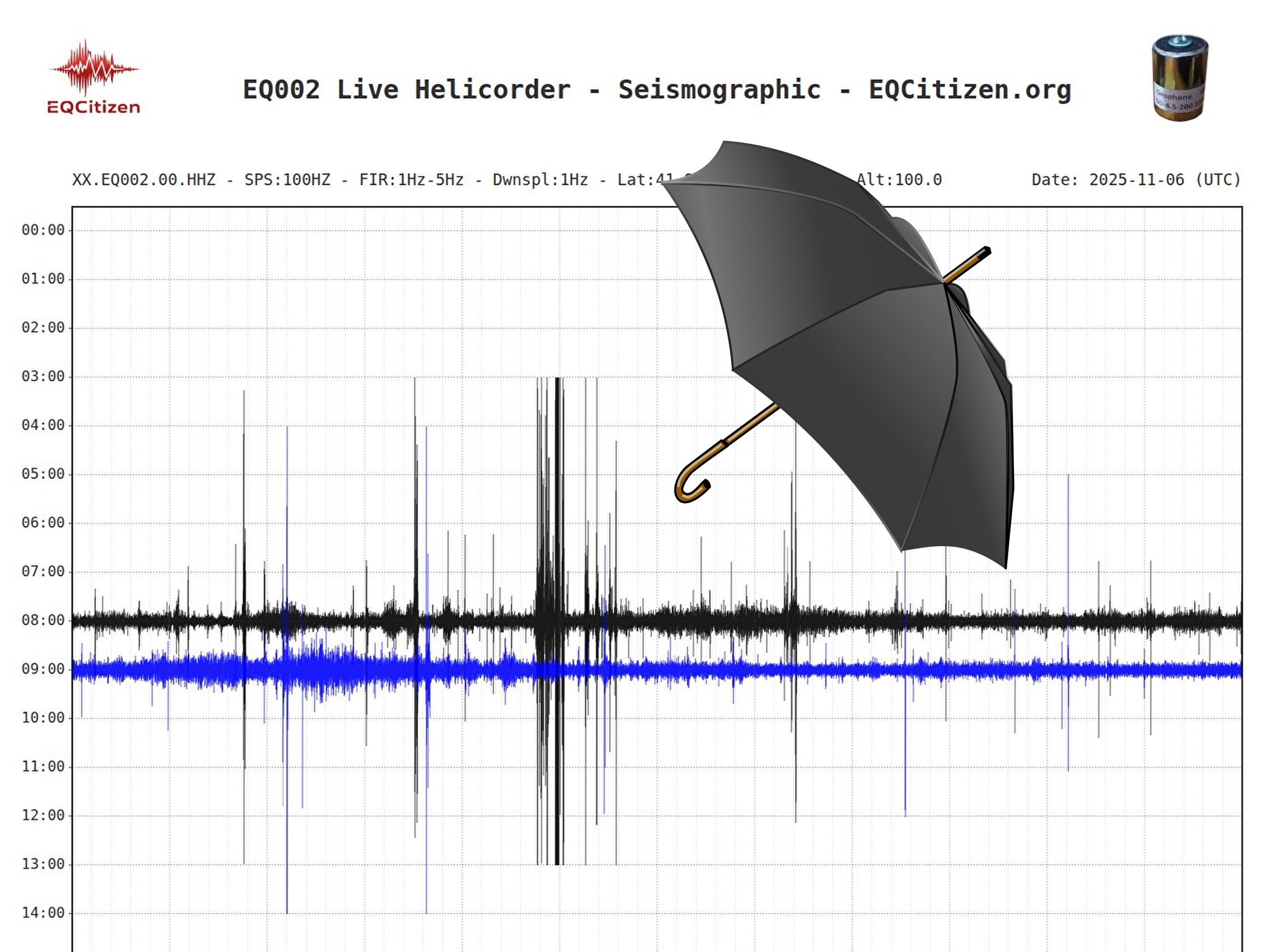 In summary, yes, it is possible to capture rain, especially torrential rain, with a Citizen seismic station, and if you want to see what seismograms would look like with a professional station, here's an illustrated post.: https://x.com/JDiazCusi/status/1977705305338200449