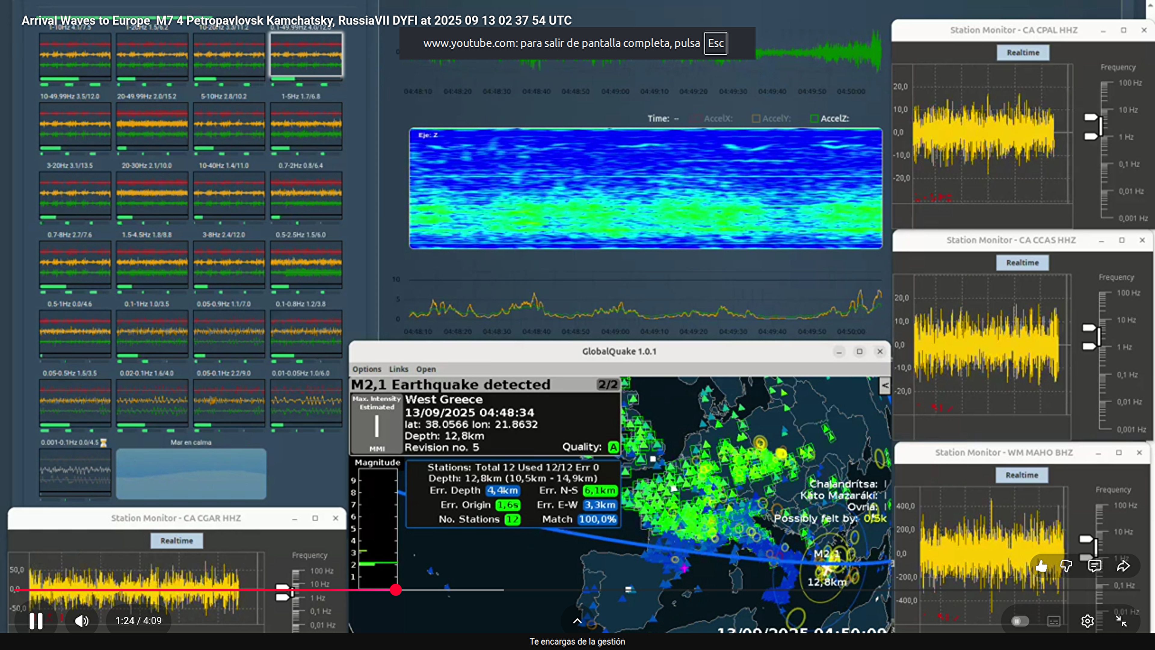 Documented arrival of the M7.4 earthquake with tsunami warning from Kamchatka at the citizen seismic station EQ002 in Girona, over 9,000 km away. Full video of the earthquake